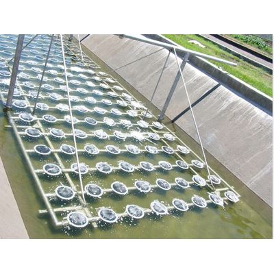 Fine bubble aeration is a subsurface form of diffusion in which air is introduced in the form of very small bubbles in order to enhance the treatment process of wastewater. Air flows through a pipe into diffusers located at the bottom of a tank. These air diffusers have numerous small openings, known as pores, which enable air flow through the wastewater in the tank. The air diffusers are located on the floor of an aeration basin, fixed to horizontal air headers which are evenly spaced along the floor of the tank zones. The air headers are connected to an air distribution pipe system which receives pressurized air from the air mains, supplied by air blowers. Compressed air from the header enters through the holes in the orifice bolt situated under the diffuser disc, and then proceeds to pass through a specialized membrane. The membrane breaks up the air into microscopic bubbles and disperses it evenly over the whole volume of the aeration zone. As the bubbles rise to the surface, oxygen is transferred via diffusion into the liquor solution.