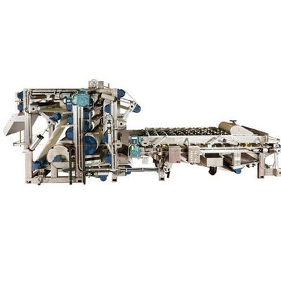 The gravity deck is positioned at eye level, allowing for accurate visual adjustments without the costly addition of catwalks, steps or risers around the Tower Press. Available in 1.2, 1.7, or 2.2 meter units, the Tower Press features an elevated discharge that is over six feet from the base of the press allowing for easier design and access to conveying equipment. Pneumatically operated doctor blades and plow lift assembly reduces labor and wash-down time. Tower Press units are also available in short deck version where space is a premium.