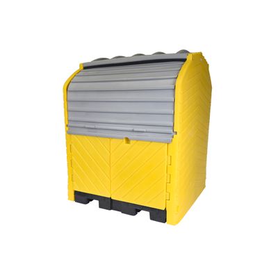 The Ultra-Hard Top 4-Drum Plus with no drain provides secure containment for up to four 205-litre drums. Made from polyethylene (LLDPE), it is rust- and corrosion-resistant with UV protection for durability. It features a roll-top door system on top and swing-out lower doors for easy access. Its "Cross of Life" design enhances structural integrity, preventing sagging under heavy loads. The unit is forkliftable, lockable, and has a low-profile 222 mm sump that positions drum tops at a safe pouring height. The front doors open wide, allowing access to drums on wooden pallets. It has a 4,082 kg weight capacity and a 283-litre containment sump, offering five years of protection against any defects in material or workmanship, making it a reliable solution for spill containment and environmental protection.UltraTech - Ultra - IBC Spill Pallet Twin 1 Right Side Bucket Shelf, Drain (3,162mmL x 1,565mmW x 558mmH) 2,025L