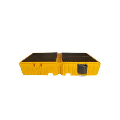 The Ultra-IBC Spill Pallet Twin 1 Right Side Bucket Shelf with Drain is a cost-effective solution for storing two IBCs side by side while ensuring spill containment compliance. It features a large 2,025-litre sump for efficient spill management and is constructed from durable polyethylene, offering excellent chemical resistance. The pallet supports up to 3,628 kg per side (UDL) and includes a right-side bucket shelf to capture drips, with an integrated overflow system directing excess liquid into the sump. The built-in drain includes a threaded hole in the sidewall with a 19mm polyethylene plug with NPT threads for easy liquid removal. Removable grates allow for easy cleaning. Backed by a five-year warranty for long-term reliability and compliance.