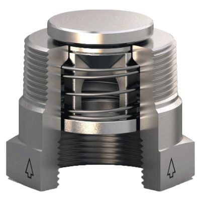 The Bushing Check Valve (BU, BR) is a spring loaded check valve with a standard pipe bushing housing. The valve is adaptable to many types of service applications. It has very little restriction and produces a low-pressure drop. It can be used quite effectively in systems where flow and pressure drop are critical by the use of a reducer coupling. This spring check valve also makes an excellent vacuum breaker. The high flow rate insures maximum effectiveness for vacuum breaker service. By reversing the direction of flow it can also be used as a low-pressure relief valve.