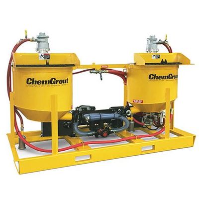 The ChemGrout CG-500HP series are skid mounted, high-pressure grout plants. These units feature two 70-gallon (265 liters) mixing tanks, a 21-gallon (80 liters) holding hopper and a high-pressure plunger grout pump. The unique double mix tank design permits continuous pumping as each mix tank alternates feeding the pump.