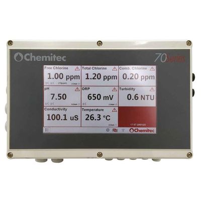 The 70 has been developed by Chemitec for industrial applications and is especially suited to the drinking water and swimming pool water treatment sectors. It is equipped with all the analogic and digital outputs to be able to control the pump and valve actuators also in a proportional mode (PID and PWM mode). The intuitive 70 series is equipped with a user-friendly interface and touch screen for quick and simple control. Up to eight parameters can be measured, displayed on the main screen and stored in the internal data logger, which can be consulted on the screen via graphic mode or downloaded via internal Wi-Fi mode.