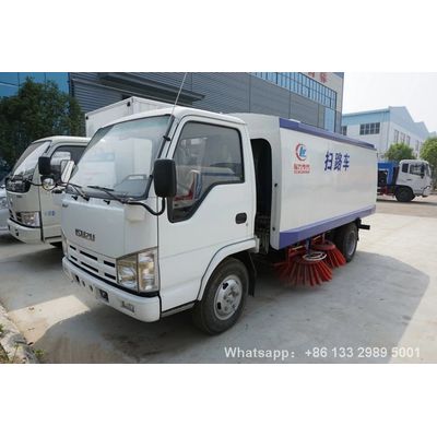 3 ton isuzu sweeper truck wheelbase 2600m, Isuzu 98-horsepower engine, air conditioner multi-function belt with 4 sweeping disks, 77-horsepower sub-engine in the cloud, Sanyo Electric, Schneider control switch, Haps solenoid valve group, stepless automatic Clutch, maintenance-free centrifugal automatic fan, electronic water pump, tail LED arrow indicator, manual pump emergency system, automatic lifting function for garbage lifting.
