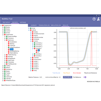The Multirun tool is built on our in-house regression test solution for Dymola and Modelica models. It enables the parallel simulation of multiple Dymola models on one PC so that the impact of changes in a model can be quickly assessed across the full suite of experiments you use to assess the system behaviour. Simply load the Modelica library that contains the experiments you want to simulate and then select the ones to be used. Select the reference data and click start. Multirun will then run multiple instances of Dymola in the background to translate and simulate the models as fast as possible by taking advantage of every CPU core available on your machine. After simulation, the new results are compared to the reference results and changes highlighted in the user interface for easy review.