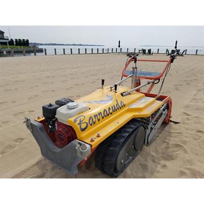The new advance Barracuda beach cleaner takes advantage of the new track drive suspension system. This prevents compaction and adds in the operators comfort with less effort in controlling and less vibration compared to older models. The Barracuda is an excellent choice for working on the sensitive beach environment and because of its size; it will produce less disruption to sand areas. The Barracuda beach cleaner has a 35" working width, designed for sand areas in the small to medium size range and well suited for soft sand.