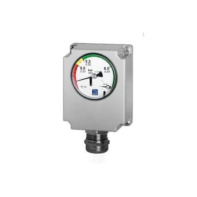 Hybrid density monitor for SF6 gas-insulated high-voltage circuit breakers; The Densistat D56Hybrid is suitable for indoor and outdoor use. It incorporates an analog gauge for relative pressure, referenced to 20 °C. The measured values are also provided as a data output signal. Microswitches inside the device respond reliably to any decreases in the density and pressure of the SF6 insulating gas. The pressure connection is either straight or angled (several options are available).