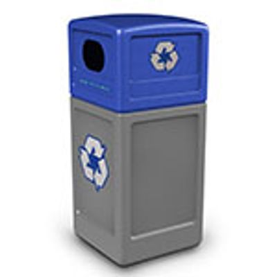 42-Gallon Dome Lid Recycling Bin. New and Improved - larger capacity with snap lock lid to base. Covered recycling container offers access on both sides for convenience. Decals allow you to personalize to fit your sustainability program. Recycling bin is made with durable polyethylene for outdoor or indoor use. Environmentally friendly; molded from at least 25% post-consumer recycled material. Decals include: Plastic Bottles, Aluminum, Glass, Plastic Bags, Paper, Mixed Recyclables and Trash. Connecting hardware available, to connect two or more units for a complete recycling system, #797900. Patented Grab Bag™ system holds bag in place, eliminating bag slippage. Two 7 ½” x 5” openings provide ideal access for recyclables. 42-gallon waste capacity, uses 45-gallon trash bags. Ships in two cartons. 1-year Warranty. Made in USA.