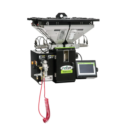 Developed to meet the needs of small-part molders, Conair’s new ultra-small TrueBlend TB-T Series gravimetric blenders deliver precise material blends from up to four ingredients at extremely low throughputs – from just one lb/hr. to up to 100 lbs/hr. Blend accuracy is an astonishing ½ of 1 percent. At less than 24 inches tall, this compact batch blender mounts easily on a machine throat or a press-side cart for use as a central color additive blender.