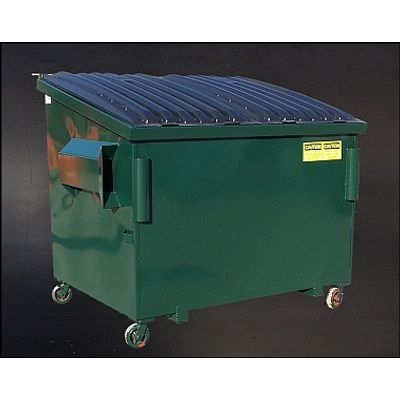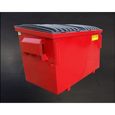 Available in 2-4 cubic yard capacities. Slant top construction. 12 GA smooth construction with 1" flanged corners and 10 GA bottom. NOT Butt Welded! Single wall plastic lids. Interlocking banding.