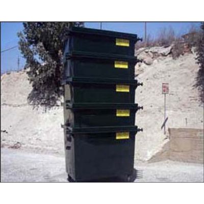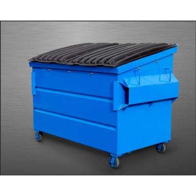Available in 2-4 cubic yard capacities. Slant top construction. 14 GA smooth construction with 1" flanged corners and 12 GA bottom. NOT Butt Welded! Single wall plastic lids. Interlocking banding.