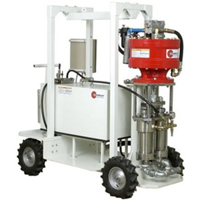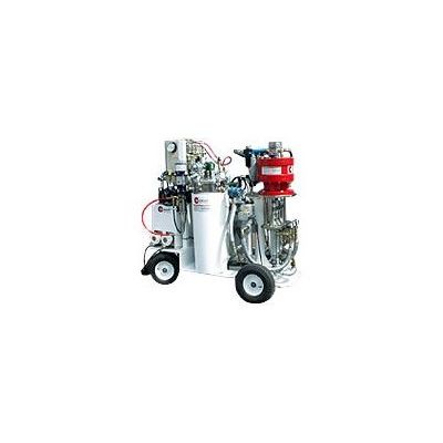 Compact single component spraying.Single Component Pneumatic Airless Spray Unit mounted on 2 wheel cart unit. Standard unit is 73:1 ratio and powered by a CoverCat 290 Air Motor. Maximum fluid delivery 232cc/cycle 9.2ltr/min (2.5gpm) @40cycles. Single Gun or Multiple Gun application of Pre-mixed Coatings. The units are capable of spraying a wide range of materials of differing mix ratio’s and viscosities where these are pre-mixed and possibly with added solvents. Pump units have nitride hardened and hard chromed piston rods and sleeves for long life.