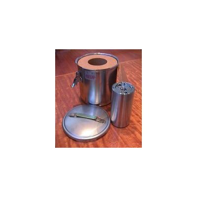 The SAFPAK consists of an Outer Container Drum (Design No 2767) which carries a resealable Inner Container (Design No 2775) within insulating and shock absorbing cork packing. The Outer Container Drum has a pressed stainless steel body with a bayonet closing action stainless steel lid. The Inner Container is a resealable stainless steel containment vessel. Cavity: 84mm x 121mm.