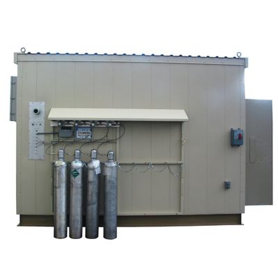 Our steel sided shelters can be equipped with easily accessible cylinder storage areas on the exterior walls of the shelters. These hood-covered cylinder racks are made of 1.5”x1.5” square steel tubing and are securely mounted to one or more of the external building walls. The hood protects the regulators and the tops of the bottles from the sun, wind, rain, and other environmental factors. The racks can either be built large enough to accommodate all the necessary cylinders for daily calibrations and quarterly QA checks or two racks can be used to house all of the cylinders, even if they are on different sides of the shelter.