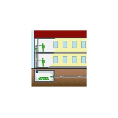 The ideal solution for multi-storey buildings. The garbage truck“s holding tank is build into a central place in the block. The shafts from the blocks are connected by a pipe system, that leads under the building to the storage site where hygienic storage containers are located. These containers are picked up by a garbage truck on agreed time intervals.