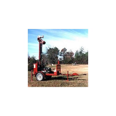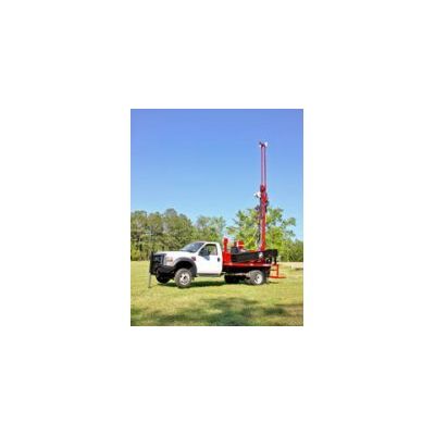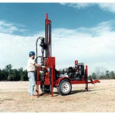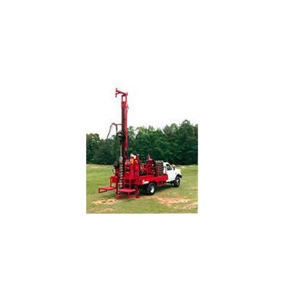 The smallest, all-hydraulic tophead rig on the market. Designed for 2` and 4` wells to 200` depth in easier soils and unconsolidated formations. Rated for air or mud rotary drilling. Water well drilling equipment available with gas or diesel power and in truck, single- or double-axle trailer, track or skid mount configurations.