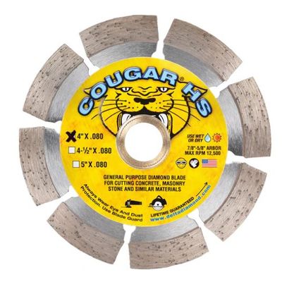 The COUGAR HS Diamond Saw Blades are engineered for versatile cutting applications in construction and masonry work. These blades are designed to efficiently cut through soft to medium aggregate concrete with a compressive strength of up to 4,000 psi, masonry materials, clay pavers, and various stones. Featuring sintered bonded premium diamond segments, the blades ensure cost-efficiency while delivering fast and smooth cuts suitable for professional environments. The unique key slot design enhances airflow, thereby improving the blade`s cutting performance. It can be used with both gas and electric hand-held power saws, and is compatible with walk-behind concrete and masonry saws ranging from 5 to 30 hp. Boasting 12MM diamond segments, these blades offer extended cutting life, though users should anticipate reduced longevity when cutting materials with rebar.