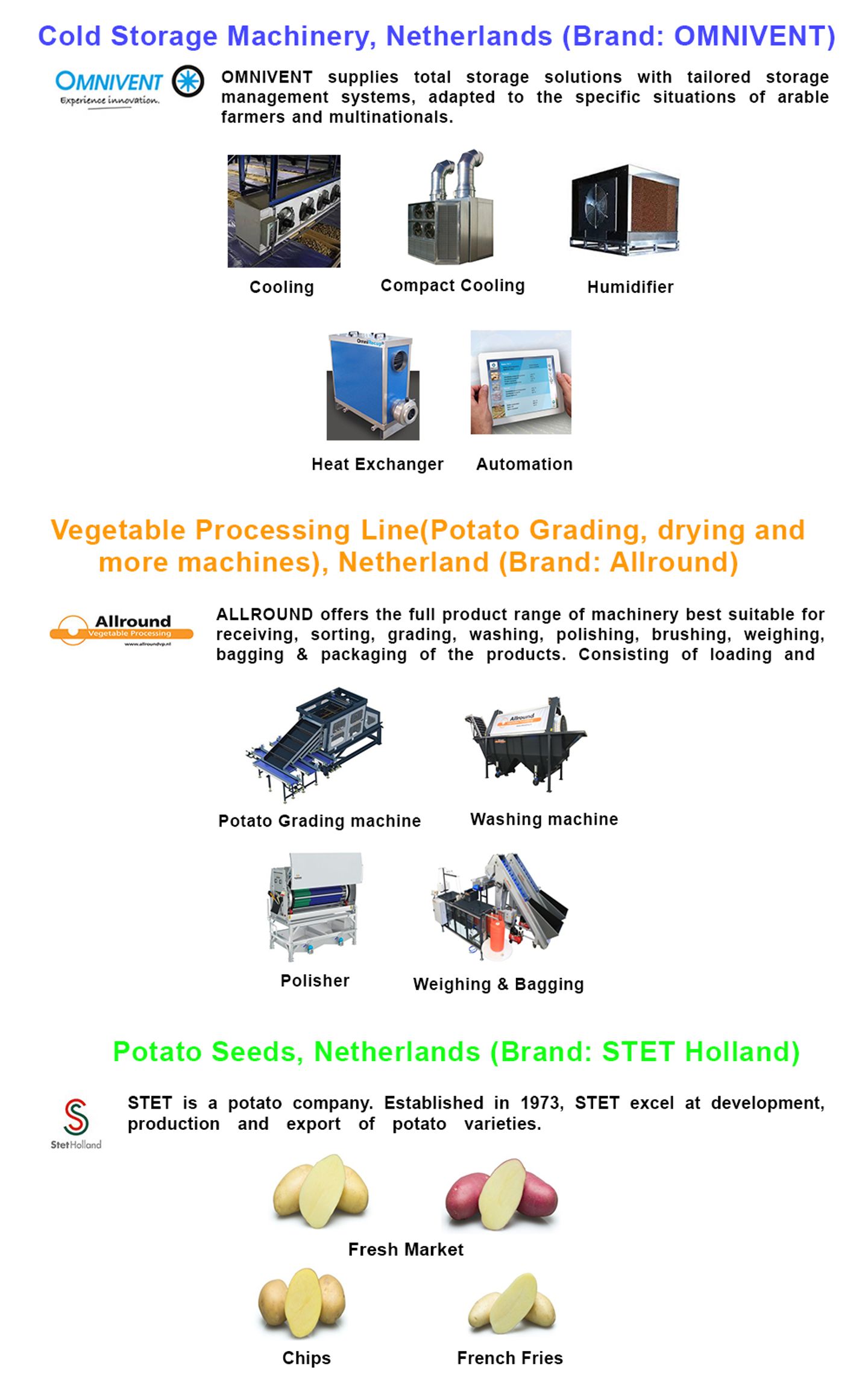 DELTADUTCH delivers a complete range of Machinery for the Agro, Food and Feed industries including Field machineries, Cold Storage, Processing, Weighing, Packaging and Handling machineries, we also supply Potato and Vegetable seeds from the Netherlands. We provide integrated and innovative solutions to increase efficiency and to ensure premium quality of end product for the export market as well as for the local market.