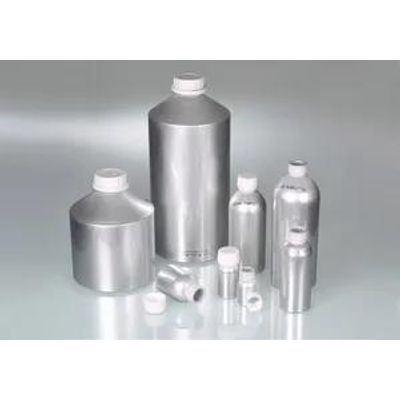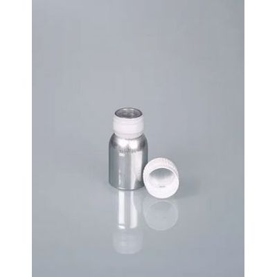 Aluminum bottle, AL 99.5, 38 ml w/ cap. Pure aluminum (material AL 99.5). With tamper-evident screw cap made of PP with aluminum inner seal. Suitable for food (exception: highly acidic and salt-containing foods). With UN approval.