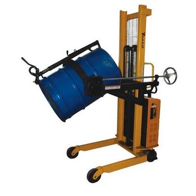 Economy Portable Drum Lifter/Rotator/Transporter - DRUM-LRT-DC. A portable Drum Lifter/rotator/transporter has a DC battery powered lift operation and a manual hand crank gear mechanism rotation (on-board charger standard). For use with steel and fiber drums. Unique design works with 55 gallon drums. Caster style rolls smoothly when loaded. Solid steel construction offers long lasting rugged use.