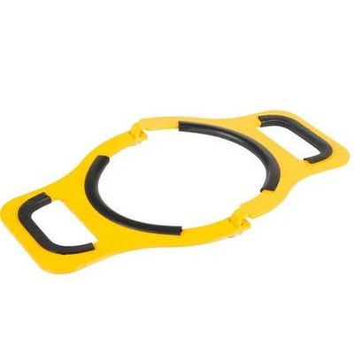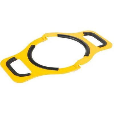 Manual Cylinder Lifter - 9 In Diameter - Steel Construction - Powder-Coated Yellow. This Manual Cylinder Lifter is easy to use and allows for safely lifting cylinders. The pivoting design grabs and squeezes the cylinder when lifted. The lifter has a rubber-coated center and handle holes. Steel construction with a powder-coat yellow finish.