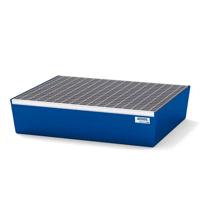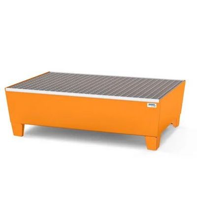 Spill pallet base-line in steel for 2 drums, painted, accessible underneath, with grid,1236x815x350. The cost-effective alternative for legally-compliant storage. Quick delivery. Welded steel design, powder coated, 2 mm. Approved for storing flammable liquids (H224-226) and substances in all water-polluting classes.