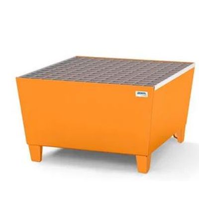 Spill pallet base-line in steel for 4 drums, painted, accessible underneath, with grid,1240x1210x425. The cost-effective alternative for legally-compliant storage. Quick delivery. Welded steel design, powder coated, 2 mm. Approved for storing flammable liquids (H224-226) and substances in all water-polluting classes.