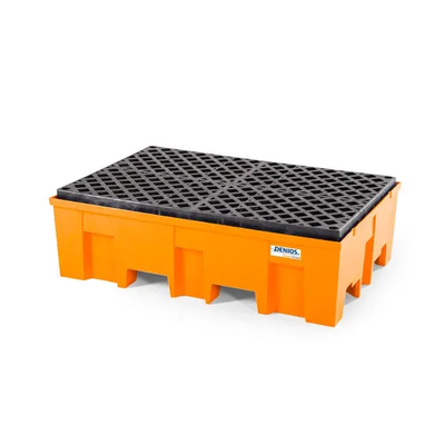 Spill pallet base-line in polyethylene (PE) for 2 drums, with PE grid. The cost-effective alternative for legally-compliant storage. Quick delivery. In chemically resistant and fully corrosion-proof polyethylene (PE). Sturdy design with good impact and shock resistance even under high temperature variations.