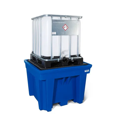 Spill pallet classic-line in polyethylene (PE) for 1 IBCs, with PE loading surface. Ideal for storing various acids and alkalis or, for example, non-flammable cleaning chemicals and substances of all water hazard classes. Depending on the weight of the IBC itself, suitable for liquids up to a specific weight of 1.8 t. Stable storage surface for safe placement of IBCs. Optimum corrosion protection, manufactured entirely from polyethylene (PE). Forklift pockets permit efficient loading of the spill pallet using lifting equipment. With surface for storing 1 x 1000 litre container or smaller containers