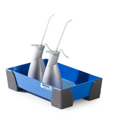 Spill tray for small containers classic-line in steel, painted, no perf sheet, 5 litres, 250x400x95. Ideal for use in the workplace, e.g. on the workbench. Store hazardous substances directly at the place of use. The sturdy plastic feet protect against corrosion and prevent damage to worksurfaces and flooring. Welded design - safe and long lasting. In high quality powder coated steel for optimum corrosion protection. Approved for storing flammable liquids (H224-226) and substances in all water-polluting classes. Sealing test with material certificate. Can be stacked to save space.