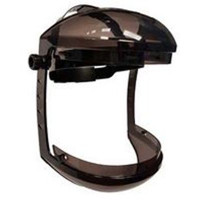 Comfortable, complete coverage for the face and neck is available with this double crown faceshield. Molded from high-strength polycarbon- ate material, it is made to withstand rugged use. Adjusting ratchet- style suspension and leatherette sweatband provide a comfortable fit against the wearer`s head. Headgear #12F483000 (Visor sold separately).