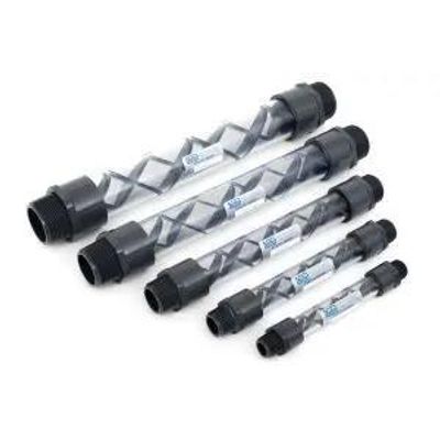 In response to a growing need for a high quality mixer at a lower price, Koflo has developed the Series 308 Static Mixer. This unit is a clear PVC mixer, which unlike other mixers, allows for a visual inspection of the mixed product. All Series 308 mixers are made in standard 6 element and 12 element configurations. Additionally, all mixers are edge sealed to the inside of the housing. The advantages of edge sealing are twofold. Not only does edge sealing increase mixing efficiency, but this bonding method also increases the structural integrity of the entire mixer. All mixers come standard with male NPT threads. Sizes 3/8″ thru 2″ are in stock for immediate delivery.