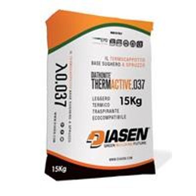 Thermal spray cork-based plaster for inside and outside, suitable for thermal insulation and dehumidification. Composed by natural raw materials, the product is suitable for historic refurbishment and green building. Cork-based natural lightweight thermal coat (grain size 0 - 3 mm – 0 - 0.12 in), lightweight silica filler and natural volcanic materials with suitable grain-size distribution. Composed by natural hydraulic lime NHL 5, the product is antibacterial and prevents the development of moulds and condensation. Diathonite Thermactive.037 is ready to use, has good performances according to fire reaction, high porosity and breathability. Thermocoat performs heat and cold insulation, contributes to indoor thermo-hygrometric comfort and maintains its properties over time.