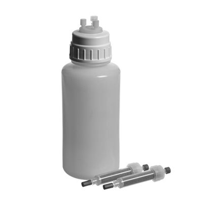 The EQAX Eluent Bottle maintains the quality of your ion chromatography eluent for a longer time by using carefully selected materials and by preventing ambient carbon dioxide from getting into contact with the eluent during withdrawal. Holds 1 liter of eluent. Eluent filters (2 ea) and EQAX-TC1 Trap Cartridge (2 ea) are included in the delivery. This HDPE plastic eluent bottle fits to any type of liquid chromatography system and enhances the stability and lifetime of your ion chromatography eluents. Contrary to glass bottles, the HDPE material will not release any noticeable amounts of ions into your eluent, thus avoiding increase of background and noise in your conductivity detector. The eluent bottle is equipped with the EQAX-TC1 Trap Cartridge, which removes carbon dioxide from the incoming air, thus preventing contamination of your eluent with carbonate ions. This ensures a stable eluent pH with unaffected elution strength and safeguards against increasing background and noise.