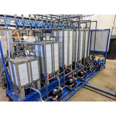 Raw, screened, or filtered liquid is first passed through the Forward Osmosis (FO) membrane stacks, where 50-95% of the water is removed by passing through the membrane and into a salt water solution.The concentrate exits the FO system and can be collected in a tank nearby.
