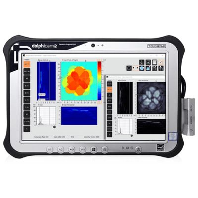 The Dolphicam2 is a compact, robust ultrasonic non-destructive testing (NDT) system designed to enhance inspection processes with its Matrix Array Ultrasonics technology. This portable device features a user-friendly interface, enabling users of various experience levels to quickly initiate inspections. Its intuitive software can conduct both rapid surveys and detailed data analyses using advanced techniques, including live C-Scan technology for real-time visualization of a component's internal structures. The system includes a 10-inch Panasonic FZ-G1 rugged tablet, a black box, various cables, and a sturdy hardshell case, ensuring durability and ease of use in diverse environments. The Dolphicam2 supports remote calibration and assistance, ergonomic design inquiry, and defect detection with comprehensive statistical information. With accessories like MAUT TRMs, the system's capability is further enhanced, making it versatile for various applications such as CFRP inspections and thin component analyses.