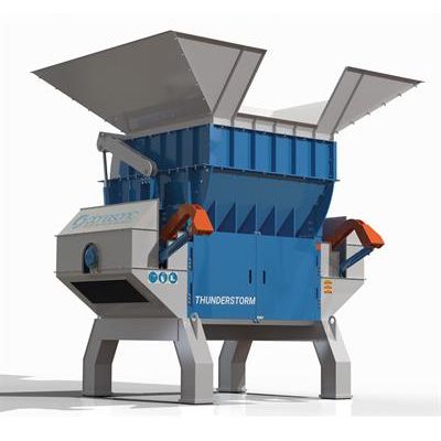The Thunderstorm is a single shaft shredding machine, utilised for the processing of a range of waste materials. The large rotating shaft installed with an array of blades and blade holders, rips bulky materials against the stator blades in order to provide a homogeneous output, dependent on the size of the built in screen perforations. Due to the size of the cutting space, assisted by the hydraulic nodding unit ensuring material is guided into the shredder blades, a large throughput can be achieved.