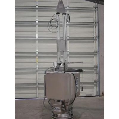 The bulk bag system has an electric hoist that lifts the bulk bag and moves it into place onto the machine. The bag is then supported by a structural table, which is mounted on vibration isolators. Either an electric or an air vibrator assists in product discharge from the bag into the collection hopper. Finally, a glove box is used to remove the drawstring on the bottom of the bag.