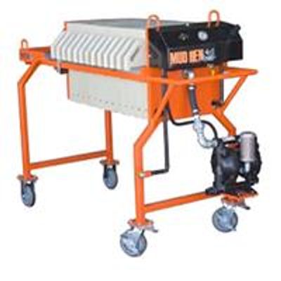 The 2.0 has twice the capacity of the 1.0 between cleanings and allows for more clean water production. The system can be designed with the portable sludge slab cart – or you can use a wheel barrel or other container for removing the sludge slabs. Dimensions 33” wide, 64” long, 48” high. Equipped with an air operated pump (Ingersoll Rand). The system needs a minimum of 5 scfm of air. The MudHen produces between 8 & 12 gallons per minute of clarified water. The MudHen holds 2 cubic foot of solids.