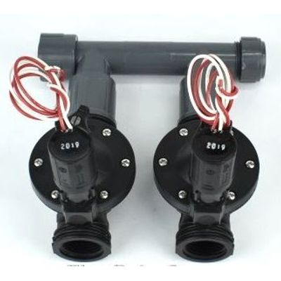 This is a 2 valve manifold with 1" 9V-DC Solenoid valves. The manifold uses Sch 80 PVC with heavy duty swivel connections. Rubber "O" Rings on all swivel connections. If you want a 3/4" outlet from these valves see the "Related Products" below for both female and male adapters. For larger manifolds just add another of this model or our 3 valve 9V-DC solenoid manifold. Mix and match any of our multi-valve manifolds as they all fit together. Just make sure the solenoid type AC or DC matches your irrigation controller / Timer.