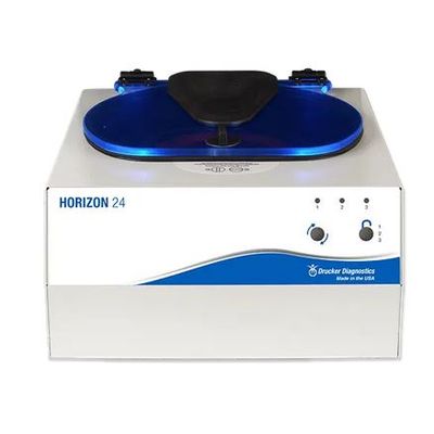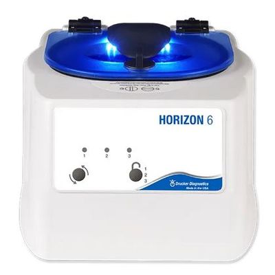 The HORIZON 6 routine centrifuge makes it easier than ever to process blood and urine specimens. Its six-tube capacity and small footprint make it ideal for labs and point of care facilities where repeatability is key. Use the simple, two-button interface to program your validated cycles, or set and lock to one of three (3) preset cycles based on recommendations by tube manufacturers and the CLSI. Bright LED lid lighting is off when the centrifuge is ready to load, on when running, and flashing at the end of cycle. Horizontal and fixed angle models available.