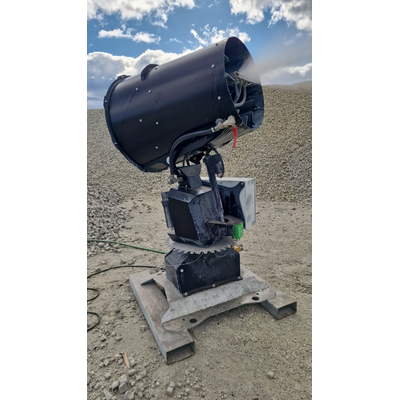 Fan motor rating 75 kW. Pump motor rating 3 kW. Current consumption 123 Amps. Throw 150 - 200 m. Dry weight 2 100 kG. Specified voltage 400 AC (380-415). Line connection L1-L2-L3-N-PE. Frequency 50 Hz. Control panel Start / Stop - Tilt up/down. Turn left/right - Auto turn on/off. Turn area setting. Remote control Hand held wireless remote control with. min range of 100 m at free line of sight. Elevation, HYDRAULIC -20 / +45˚. Automatic turning system 15˚ or 30˚ or 60˚. Turning area All around, no mechanical limit. Water flow 30 - 70 LPM (adjustable). Water connection Thread 1” BSP (DN25). Required in pressure 2 - 10 bar (min flow of 70 LPM). Water quality Portable / non portable. Operating temp. -25°C to +40°C (winter kit needed below 0°C ). Storage temp. -30°C to +60°. Length 3 200 mm. Width 2 200 mm. Height Transport: 2 540 mm. Operational: 2 930 mm.