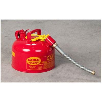 Eagle`s 2.5 Gallon Type-II Safety Can (U226S) feature two openings, one with a pressure-relief spring closing lid for filling, one with an actuated pour valve with a flexible metal spout for safer controlled dispensing. The filler spout and flame arrestors in both openings are non-sparking brass designed for flashback protection. Can includes a 7/8` flexible metal spout and a red (for gasoline and other flammable liquids) powder coat finish with a trilingual label. FM, UL, and ULC Approved and meet OSHA and NFPA Code 30 requirements. Compliance: OSHA 29 CFR 1910.106, 1925.152 and NFPA Code 30.