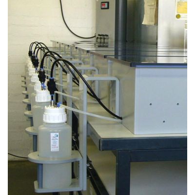 Determination of pF curves with vacuum. Extension module for pF laboratory station and pF pressure step module, simultaneous use of different pressure steps. Up to 40 soil sample rings (100 cm³), Extends sample capacity and pressure step spectrum, Includes sampling bottle with level adjustment, Precise adjustment of vacuum and drainage level, Optional: Module with sample saturation,