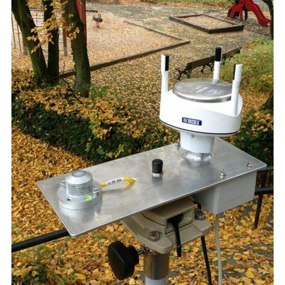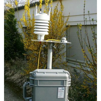 Mobile weather station with integrated data logger to measure wind velocity, wind direction, precipitation, air temperature, relative humidity, barometric pressure, global radiation and soil temperature. The sensor equipment contains a Meteo MS multi sensor, a silicon pyranometer and a digital Pt1000-temperature sensor.