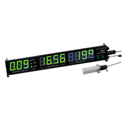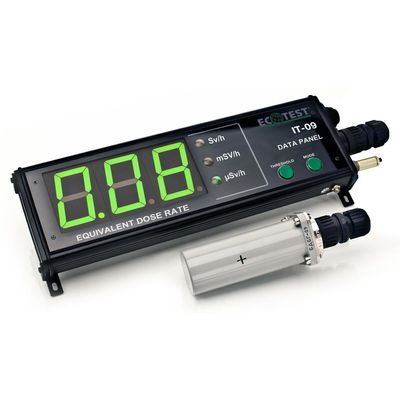 Displays information about ambient dose equivalent rate of gamma radiation, real time and temperature. The data is communicated from the BDBG-09 detecting unit of gamma radiation, which is included in the delivery kit. IT-09T data panel together with the BDBG-09 detecting unit of gamma radiation, interface converter, and special software allow creating an automated system for continuous monitoring of background radiation. The panel is placed inside and the BDBG-09 detecting unit of gamma radiation can be located inside or outside for a comprehensive control of the facilities. The distance between the data panel and the detecting unit can reach 50 m. The obtained data is continuously transmitted via interface converter to a personal computer that allows the monitoring of all objects.