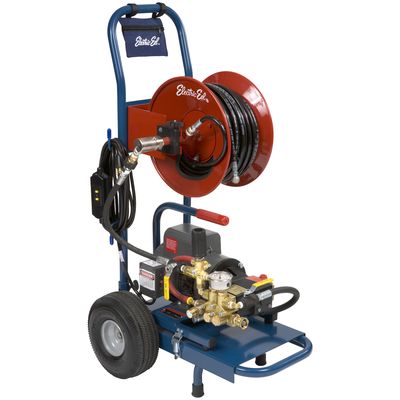 Blast through grease, sand, soap, and sludge with the EJ1500 Water Jet. The Model EJ1500 features a 1500PSI/1.7 GMP duplex pump with pulsation, a thermal relief valve, an inlet shut off valve, and a 20ft. power cord with built-in GFCI. Extremely portable, the EJ1500 is available with sturdy 10″ pneumatic tires and hose reel with removable handle (as picture). The pump/motor assembly removes from the base in seconds for added portability.
