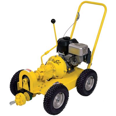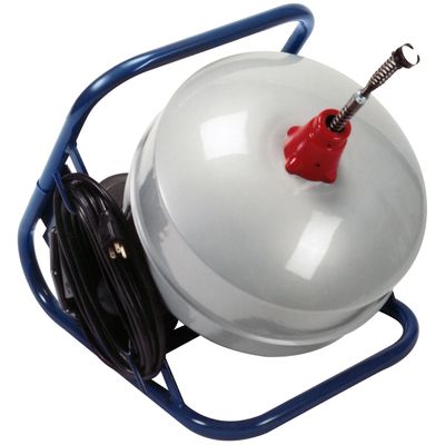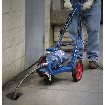 Cleans 1-1/4” – 3” diameter lines up to 100 ft. while running 1/2″ dia. galvanized aircraft wire inner core cable. Built-in drum shaft slip clutch. Upright frame on large 10” wheels with folding handle. Rear bar shields motor and allows for two position operation. Steel guide tube/inner drum. 1/2” x 75 ft. cable standard.
