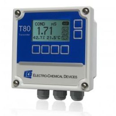 The Model T80 Conductivity Transmitter is one part of the Model T80 Universal Transmitter product line. The T80 Transmitter offering includes the pH Transmitter, ORP Transmitter, Ion Selective Transmitter, Dissolved Oxygen Transmitter, Turbidity Transmitter, Conductivity Transmitter and Resistivity Transmitter. The T80 Transmitters are available as single channel or dual channel instruments. The Model T80 transmitter digitally communicates with any ECD S80 digital sensor, automatically configuring the transmitter’s menus and display screens to the measured parameter. There is no longer a need to inventory multiple instrument types, the one Model T80 Conductivity transmitter will automatically configure to any of the listed measurements.