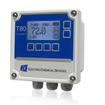 The Model T80 Turbidity Transmitter is one part of the Model T80 Universal Transmitter product line. The T80 Transmitter offering includes the pH Transmitter, ORP Transmitter, Ion Selective Transmitter, Dissolved Oxygen Transmitter, Turbidity Transmitter, Conductivity Transmitter and Resistivity Transmitter. The T80 Transmitters are available as single channel or dual channel instruments. The Model T80 transmitter digitally communicates with any ECD S80 digital sensor, automatically configuring the transmitter’s menus and display screens to the measured parameter. There is no longer a need to inventory multiple instrument types, the one Model T80 Turbidity transmitter will automatically configure to any of the listed measurements.
